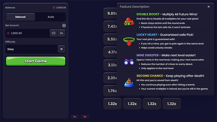 При смене режимов увеличиваются потенциальные выплаты, однако продвижение по «башне» становится сложнее. Также провайдер добавил специальные клетки, доступные только на двух последних уровнях. Double Boost удваивает все выигрыши. Lucky Heart дает страховку на следующий ход. Mine Sweeper открывает одну случайную ячейку без участия пользователя. Second Chance продолжает игру даже при попадании на мину.