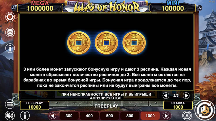 Провайдер не установил максимальное количество вращений. Бонусный раунд продолжается до тех пор, пока не закончатся попытки или все ячейки не заполнятся изображениями монет. Выпадение 15 денежных символов приносит х1000 независимо от того, какие номиналы выпали изначально. Слот не поддерживает покупку бонуса.