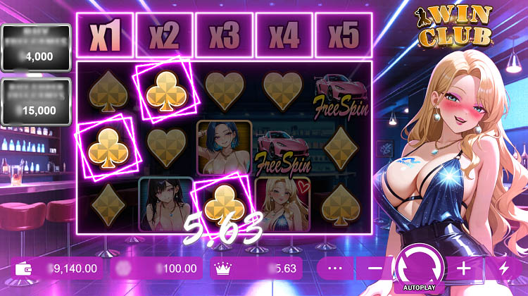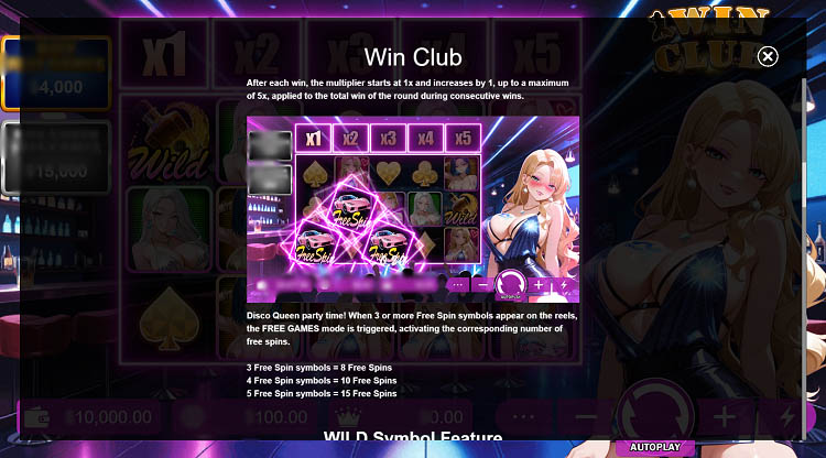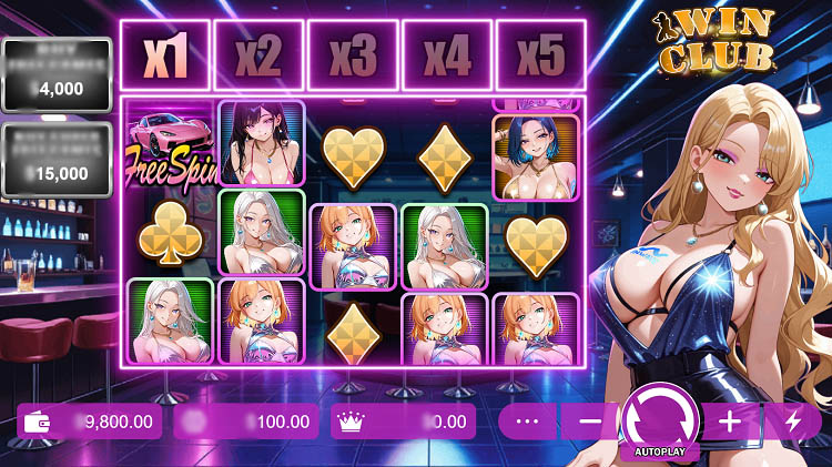 Слот выполнен в стилистике аниме. Неоновые огни и диско-музыка создают атмосферу ночного клуба. На заднем плане изображена барная стойка. На всех этапах игры пользователей сопровождает длинноволосая девушка, которая смущается при выпадении каждой комбинации. Официальная демоверсия слота Win Club доступна на странице для бесплатного запуска.