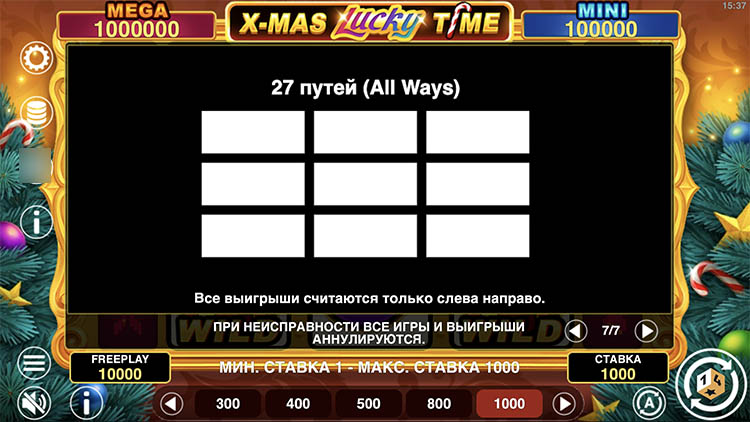Это игровой автомат с 3 барабанами и 27 активными линиями, которые считаются слева направо. Если все поле заполняется одинаковыми фруктовыми символами, выплаты удваиваются. Также на барабанах встречаются: